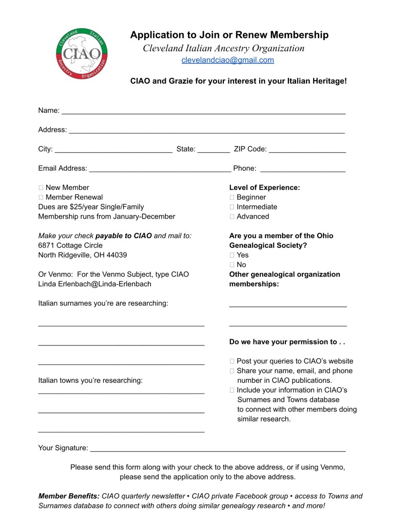 CIAO’s membership year runs January through December. You must be a paid member to receive the newsletter Genealogy Giornale and be included in the CIAO Facebook Group.